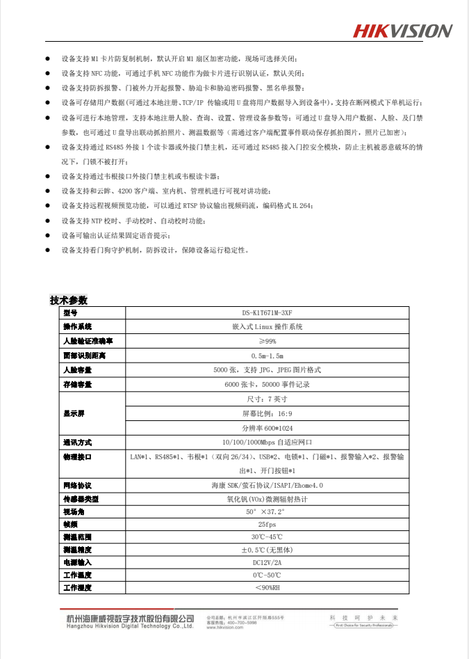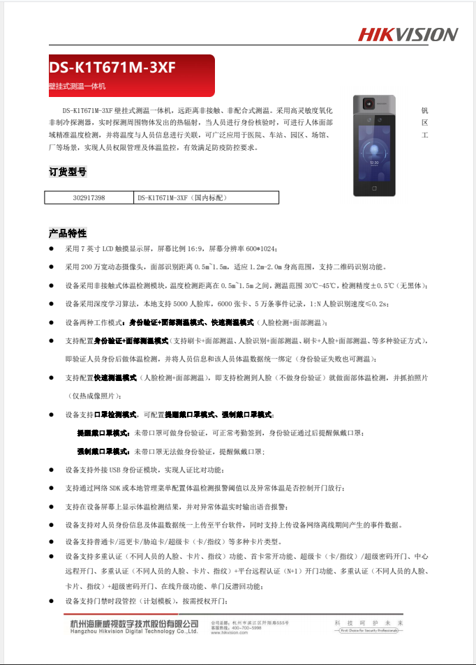 DS-K1T671M-3XF壁挂式测温一体机20200925 自营