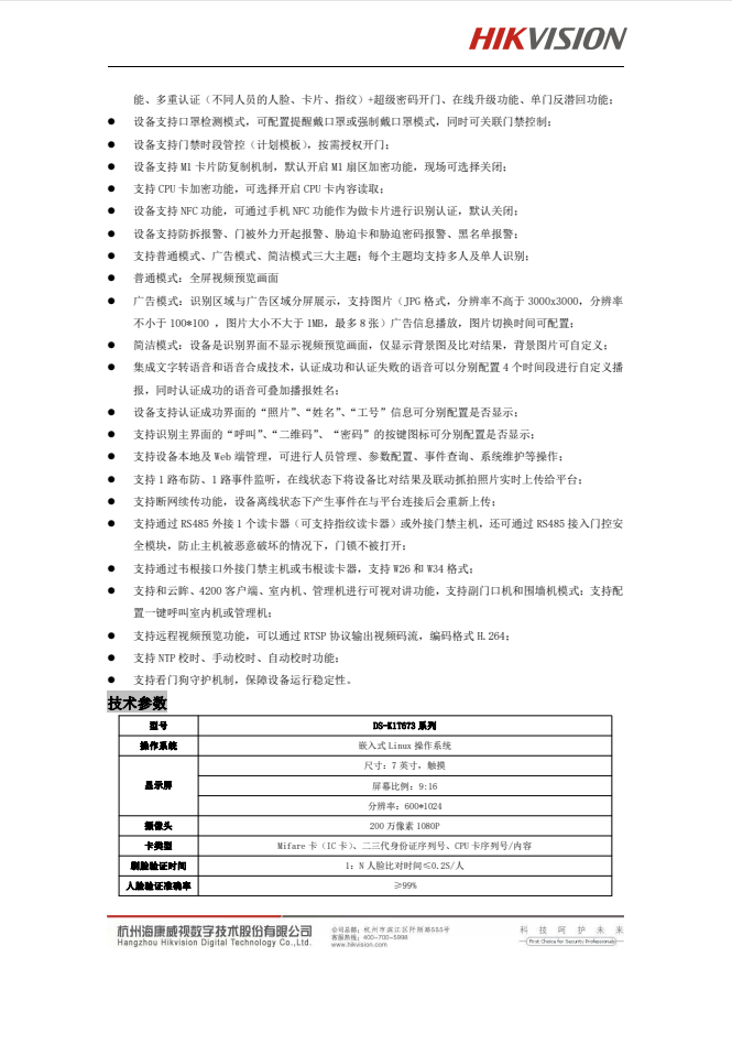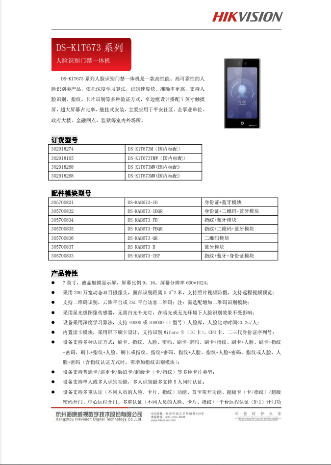 DS-K1T673系列壁挂式人脸识别门禁一体机20210907